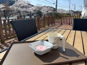 こうして桜を見ながらテラスでおやつを楽しんでいただけるのは